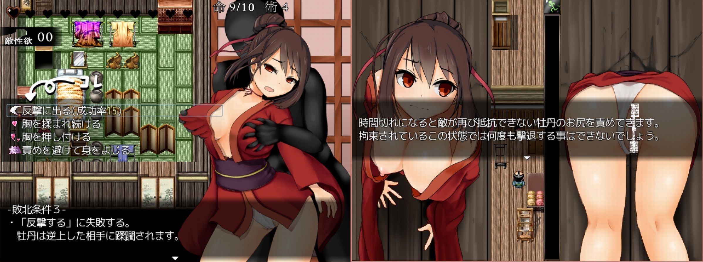 相手のセクハラを誘い、隙をついて反撃できます。誘えば誘うほど成功率が上がりますが、牡丹がイってしまったり、反撃に失敗すると・・・・・・・・・・・・・・・お・し・ま・い。
