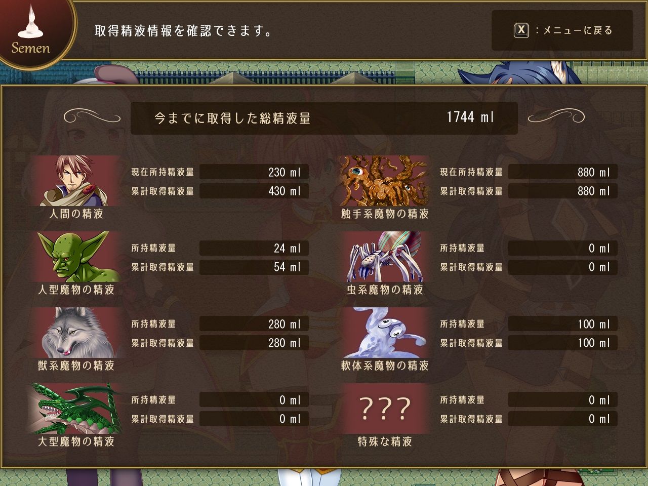 媒体の精液は、人間、魔物、触手系、虫系など、全8種類の精液によって生成できるアイテムは異なります。