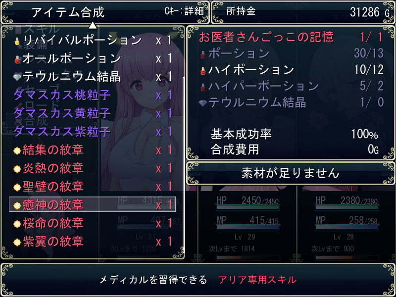 合成では、イベントで入手したレア素材や、敵からのレアドロップ(ソウル)を使用することで、