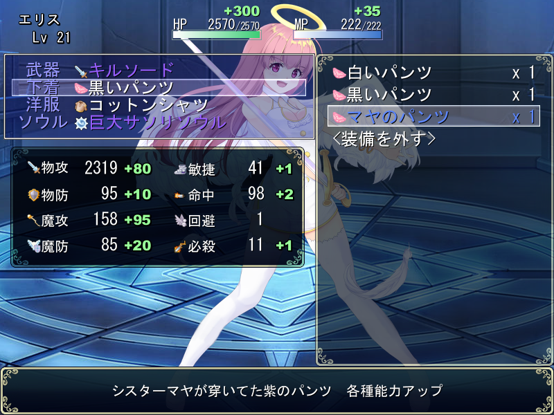 また、各種装備「武器・下着・洋服・ソウル」のステータス変化も非常に大きいです。