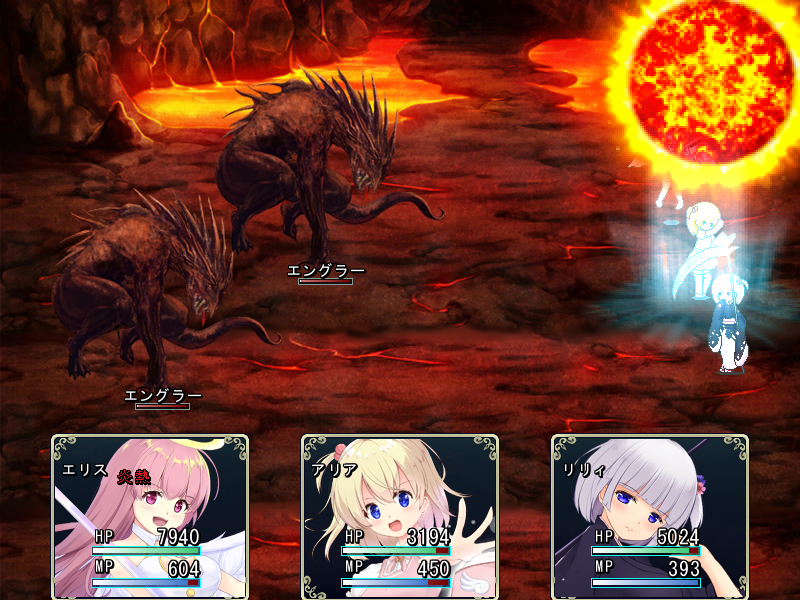 戦闘は、オーソドックスなターン制で、パーティはヒロインの三人です。