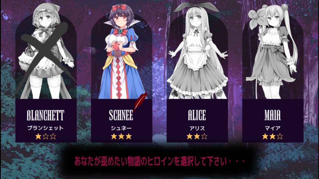 | ▼誰もが知っている『4つの童話』の物語を歪めろ! | ▼ADVパートではヒロイン視点で物語が進みます! | ||