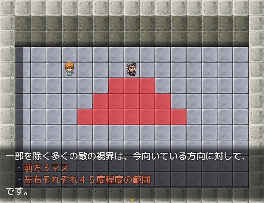 敵は人間型や魔物など様々ですが、それぞれ視界を持っており、見つかると即時に戦闘に移行します。