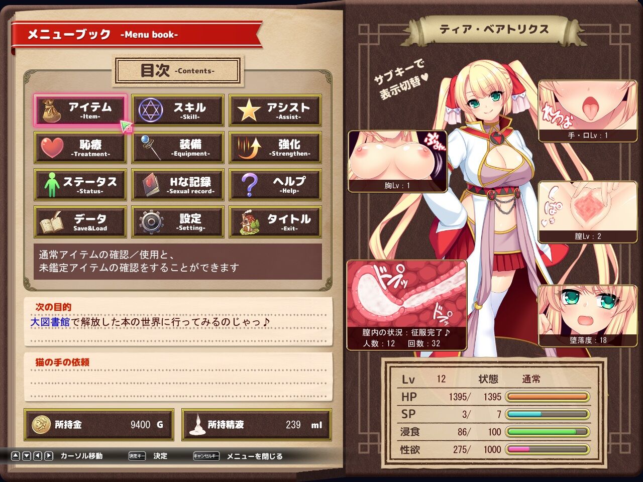 また、「淫乱状態、浸食度、堕落度」の各Hステータスは、アイテムによって変動させるも可能です。