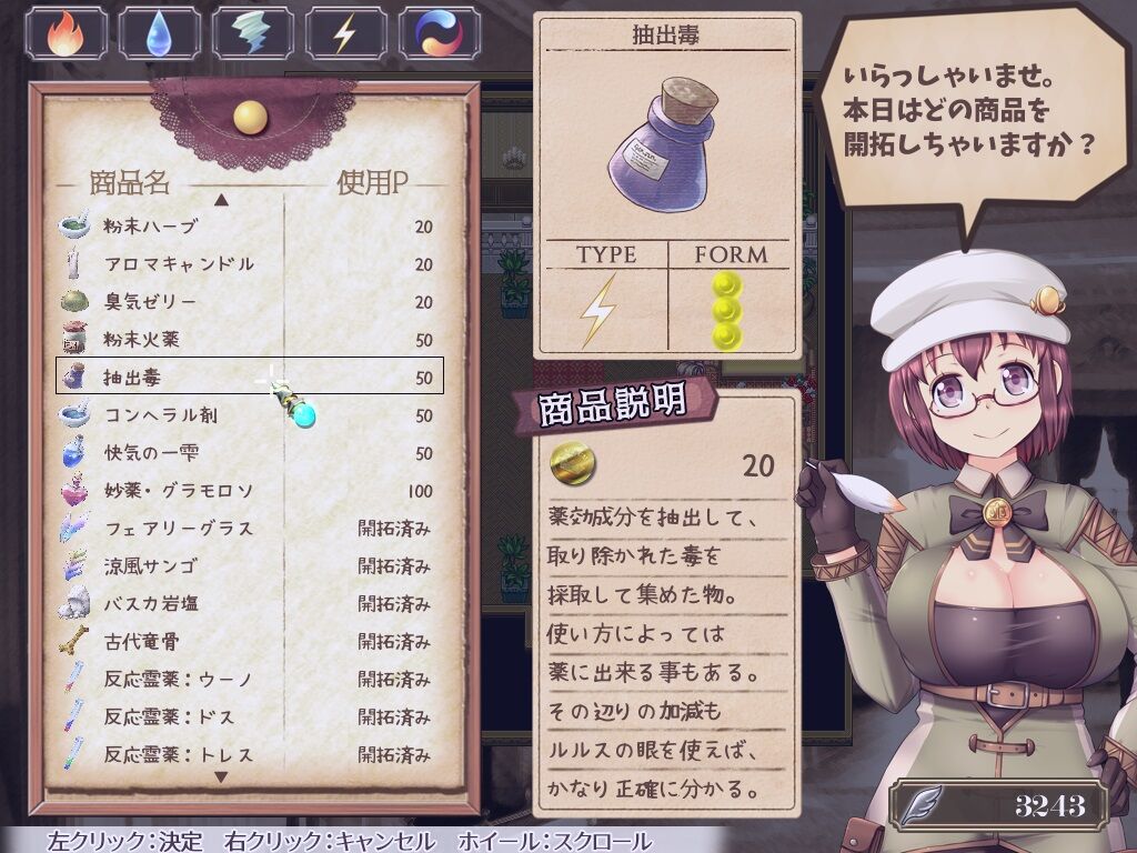 攻略を目指しましょう!しかし、おそらく1ステージだけですが「雑貨屋さん(製薬スキルなし)」を