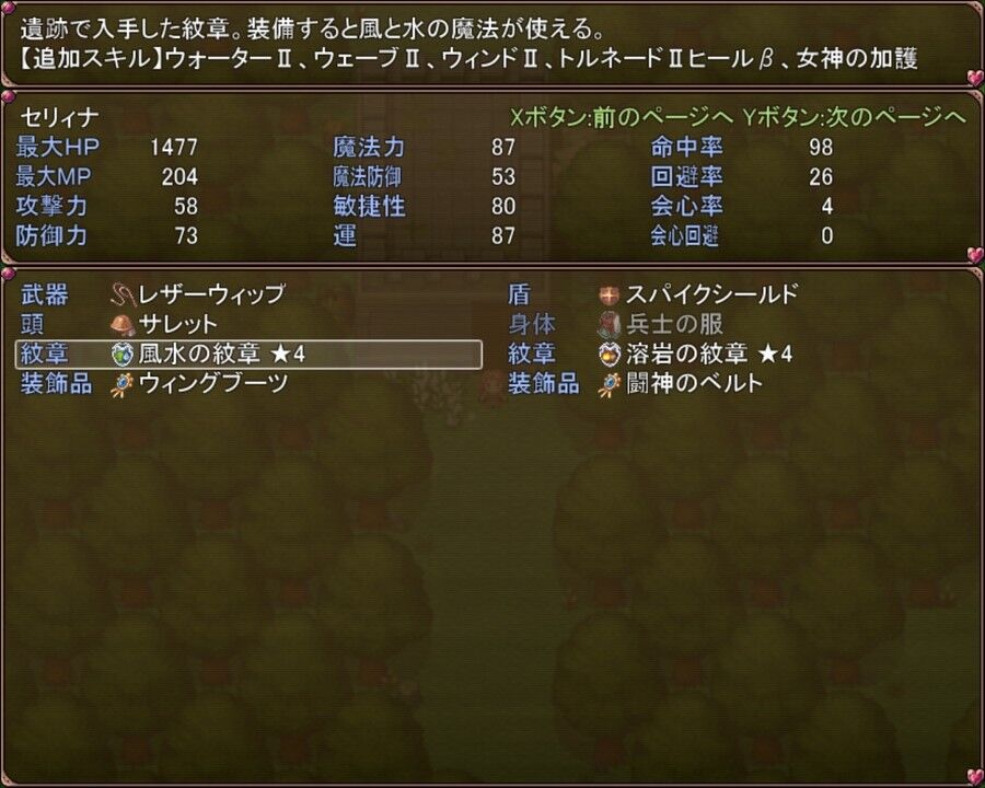 紋章は2スロット式の装備品であり、属性魔法から回復補助まで切り替え可能な万能アイテムです。