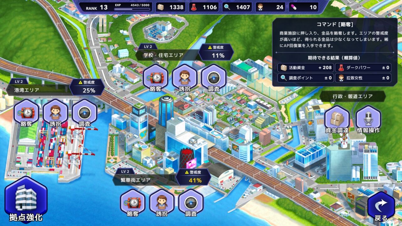 | ▼プレイヤーは悪の組織【ガンジータ】を操作 | ▼活動で資源を集め、強力な怪人を作り出せ! | ||