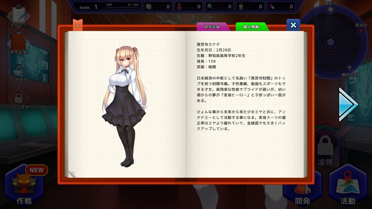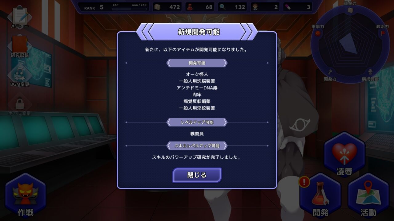 ゲームの流れは分かり易く、怪人や兵器を開発することで、それに該当するシナリオが発生します。