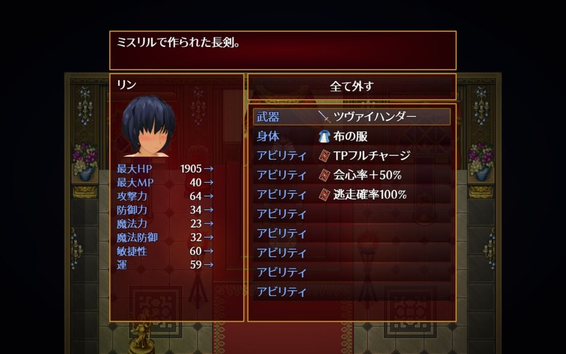 アビリティは、「会心+50%、TPフルチャージ、逃走確率100%」があれば十分だと思います。