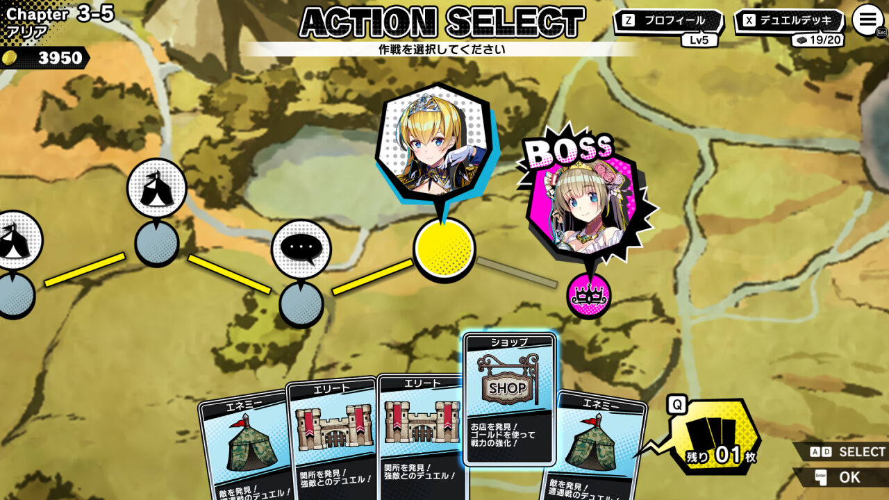 ランダムで配置される「エネミー戦」や「ショップ」を活用して『デッキ』を作り上げます。