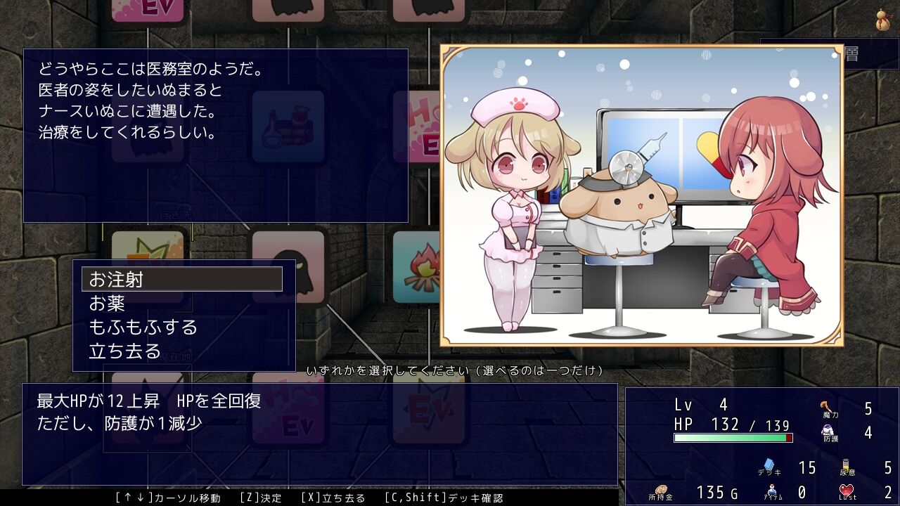 | ②お薬 | Lustが30減少、防護が1上昇 | |