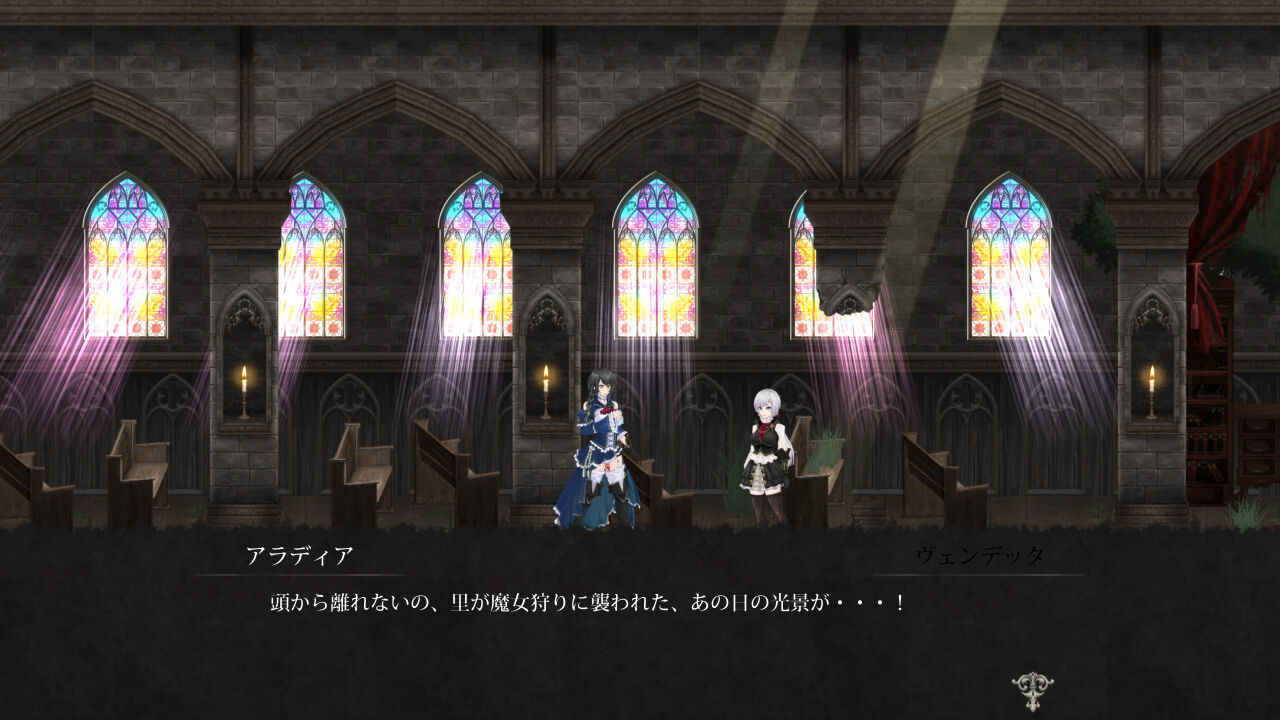 渦中に巻き込まれ、全てを奪われた魔女《アラディア》が、因縁の教会に立ち向かう復讐劇です。