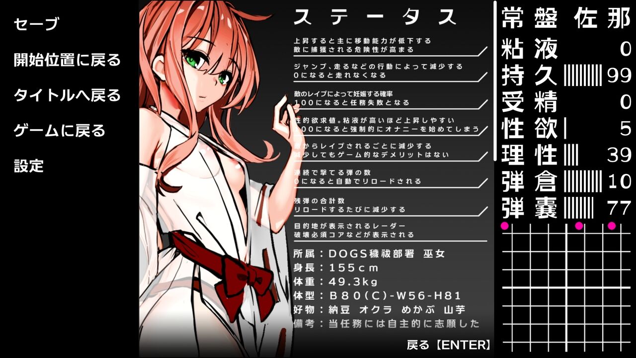 ・《粘液》が80を超えると、敵に接触された際に犯されて初期地点からやり直しです。