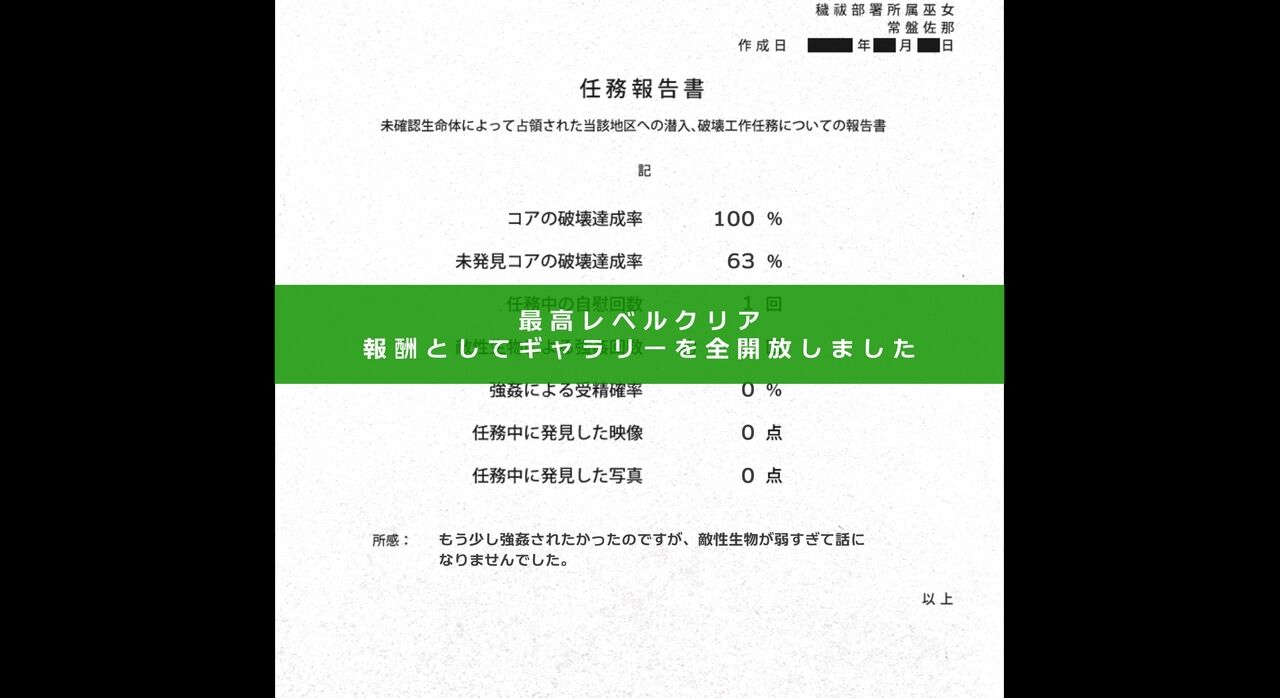 任務の内容は「不明敵対生物に占領された区域への潜入破壊工作」女性を孕ませる化物の巣窟で