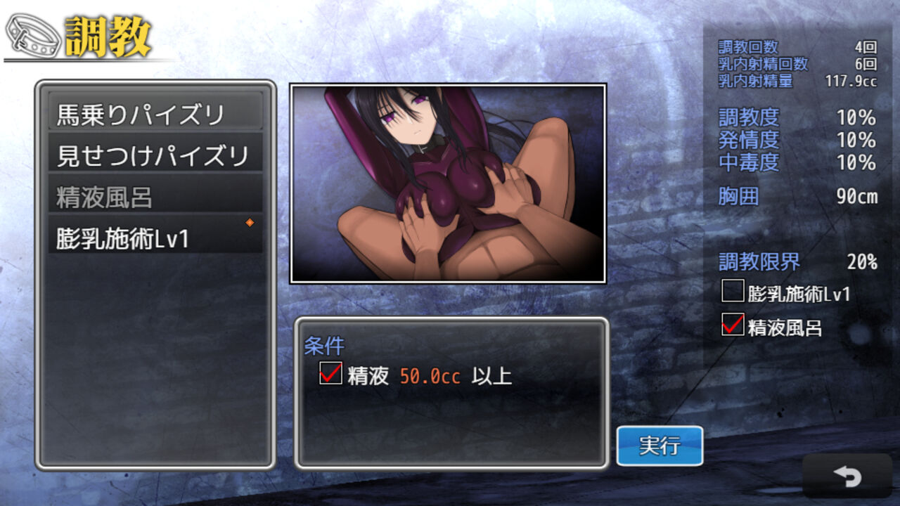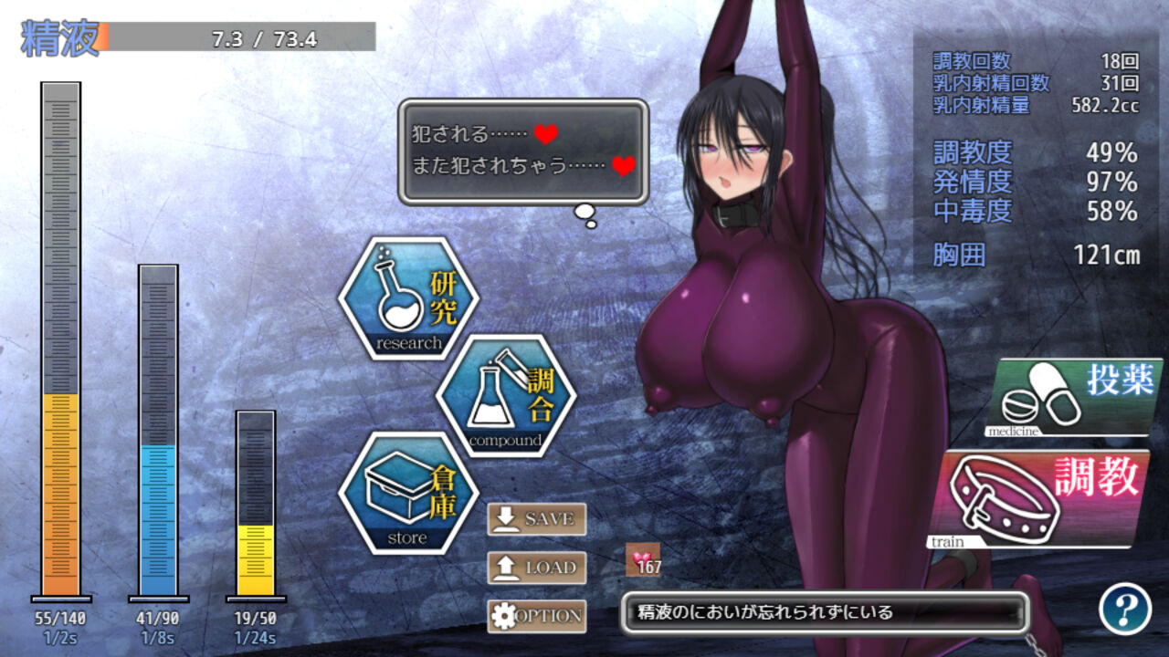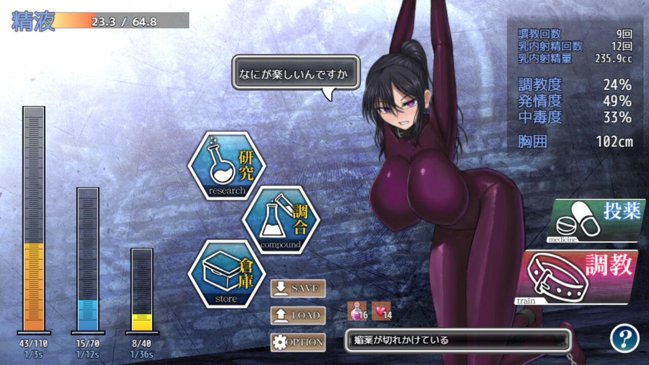 必要なリソース(精液・試薬)を溜めて『調教』や『研究』を進めていきます。