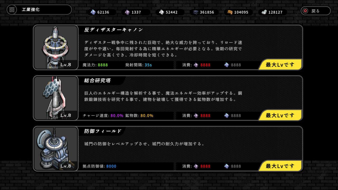 反ディザスターC、防御フィールドなどは、防衛戦で苦戦するまでは放置でOKです。