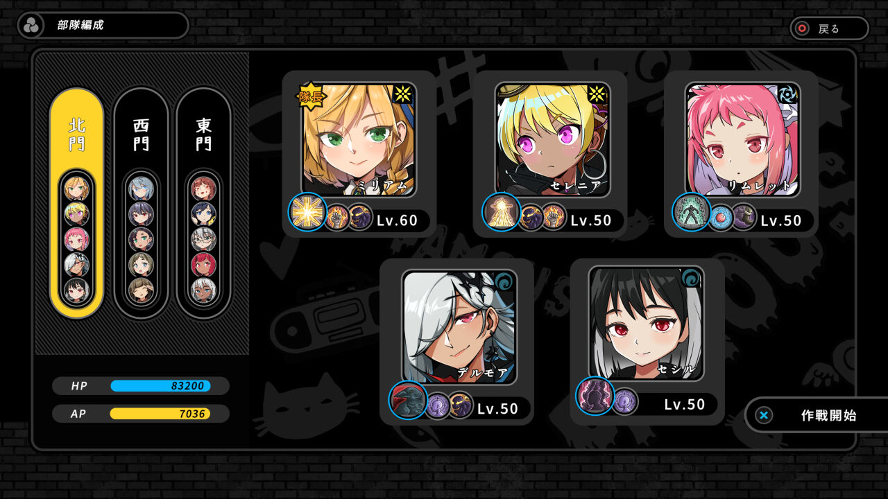 部隊は門の数と同じく3部隊。1部隊5名編成のため、ほとんど全てのユニットを使用します。