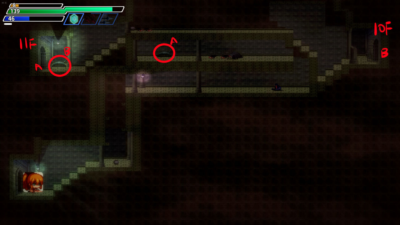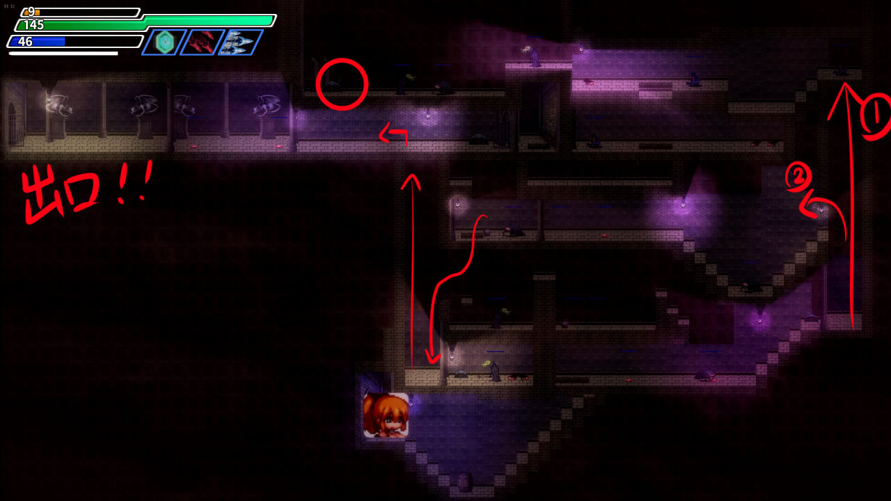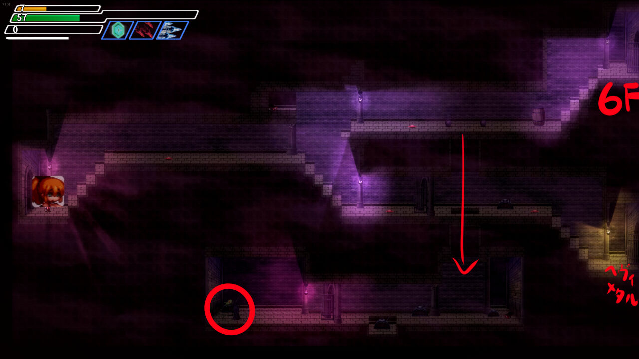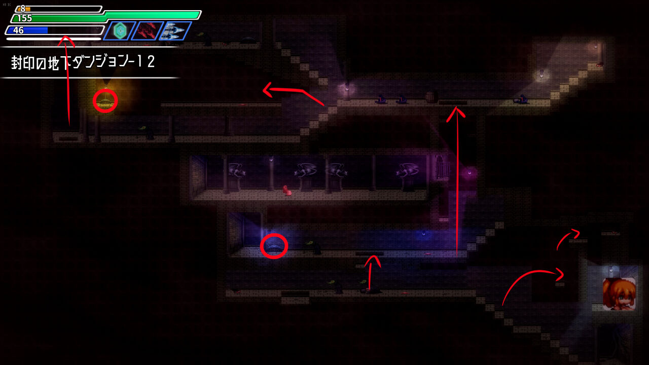 進行は、各階層に隠されたスイッチを見つけることで、次回層の扉が開錠されるギミック系です。