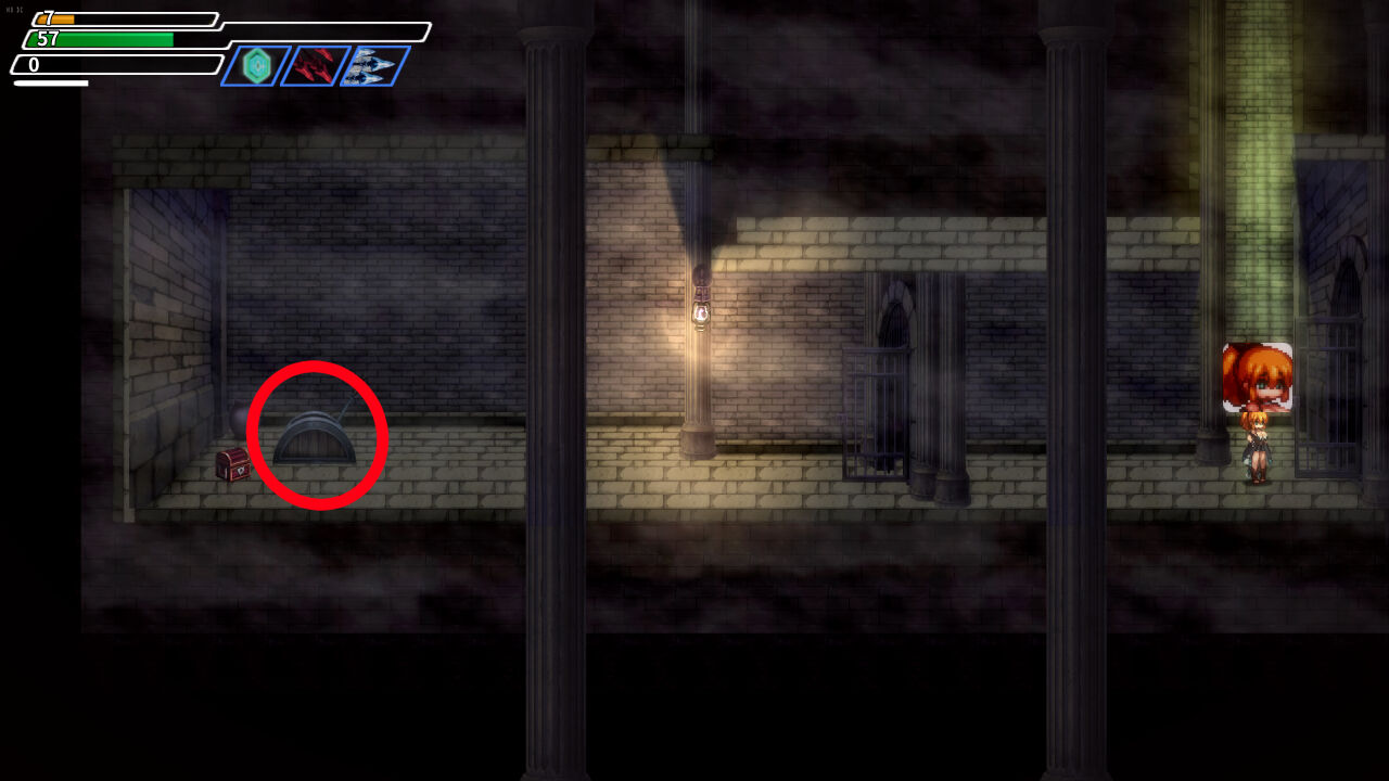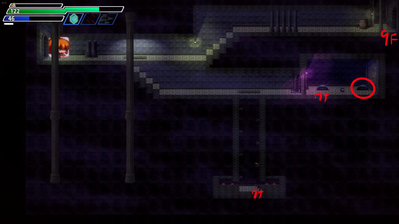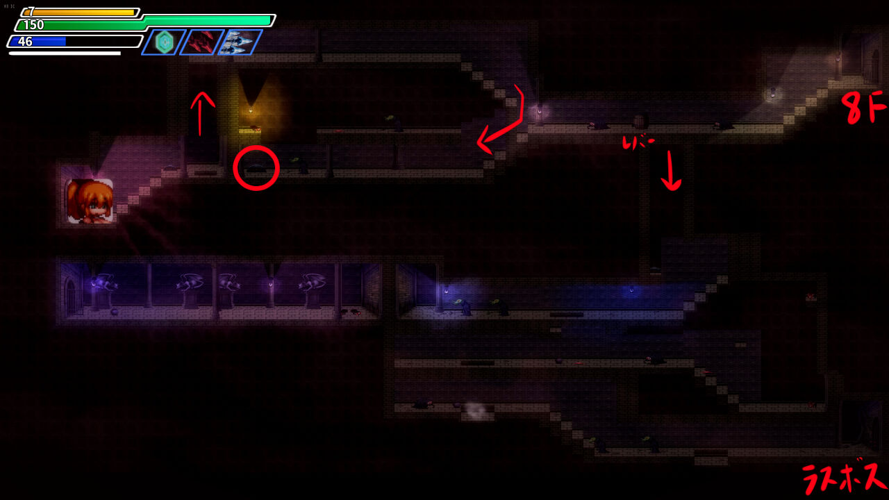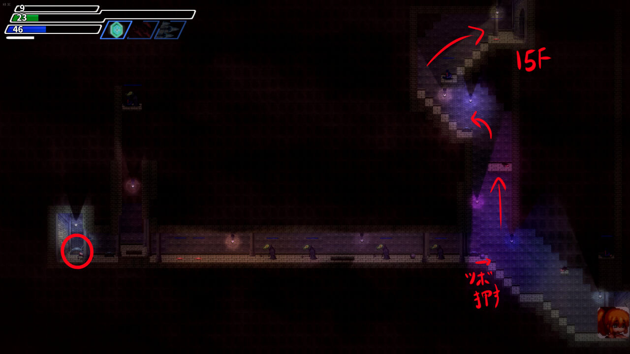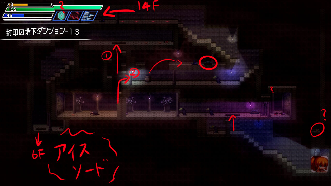 ┣ ③13階層の中央右の鉄格子部屋の上から迂回して右下に降りる。
