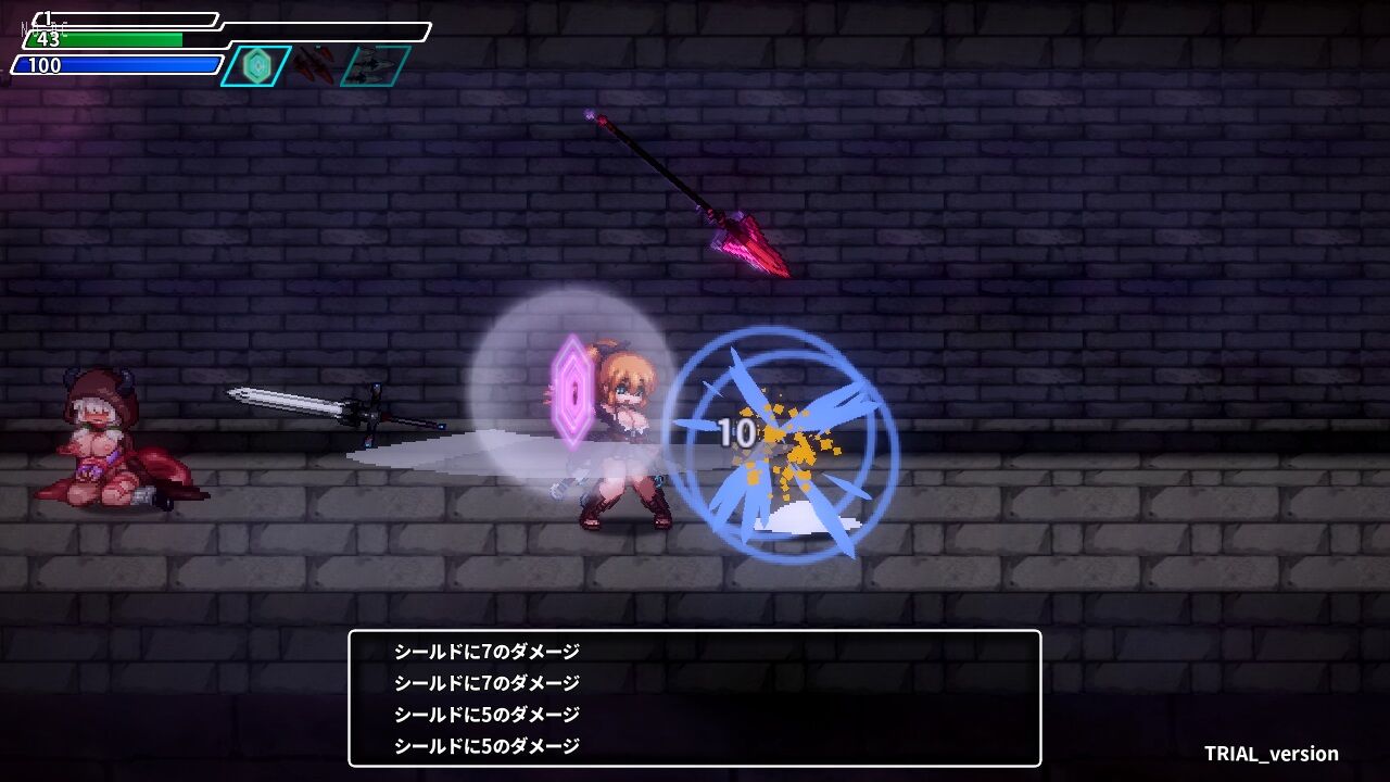 ┣ Cキー … 攻撃(+上キー:槍飛ばし、+下キー:短剣飛ばし)