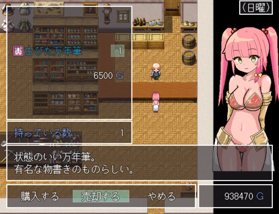 上記後、夜に道具屋の裏手で店主と話す。 ⇒以降、淫乱度30以上で全裸解禁 |