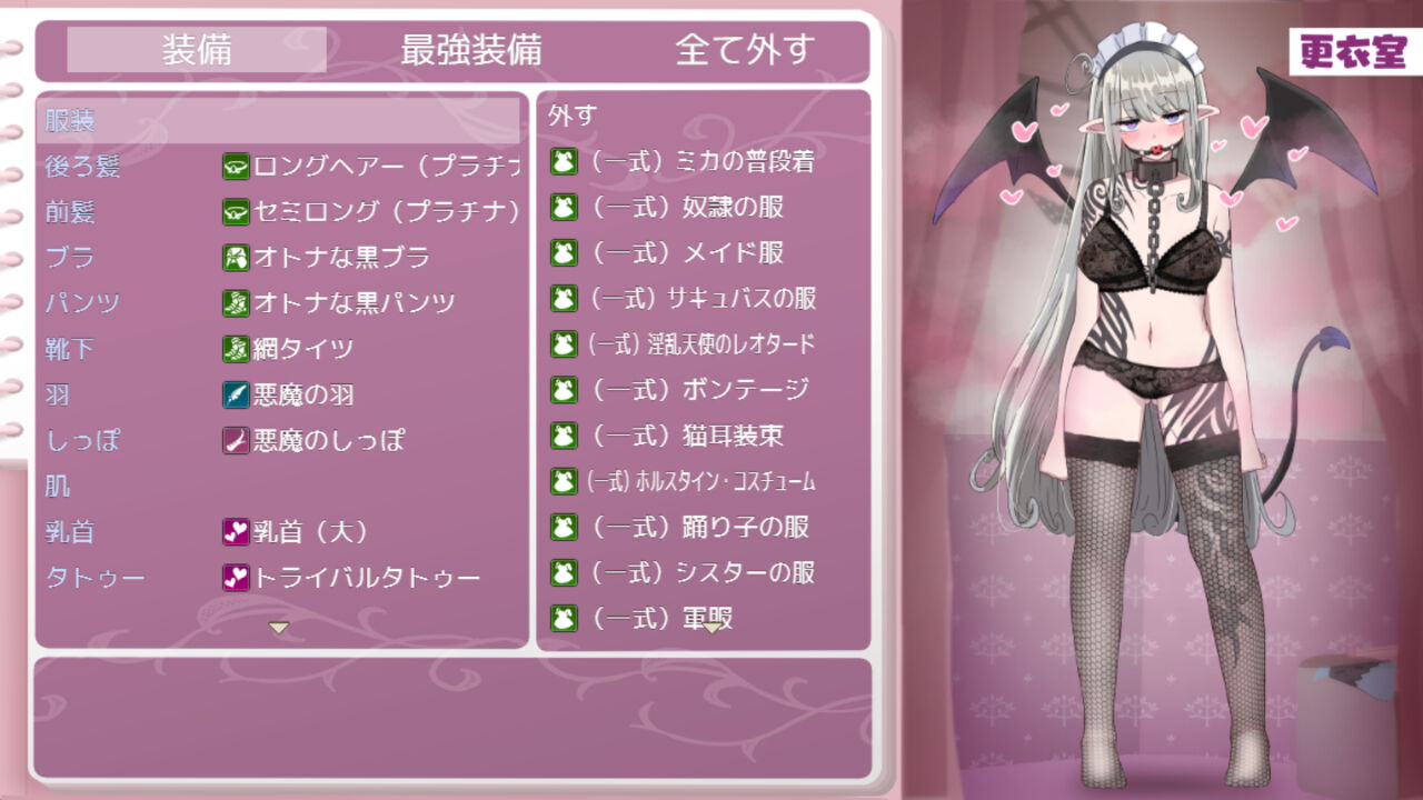 細かく見て欲しい要素は「着せ替え、ドットエロ、エロステータス」です。着せ替えの幅が広く、