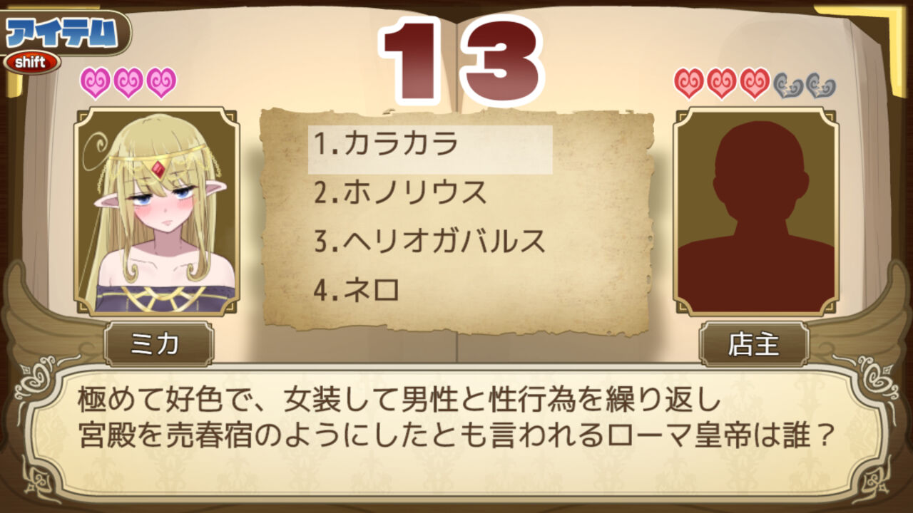 本編⇒エッチ⇒本編を繰り返す流れですね。また、戦闘の代わりに『クイズ』を採用しています。