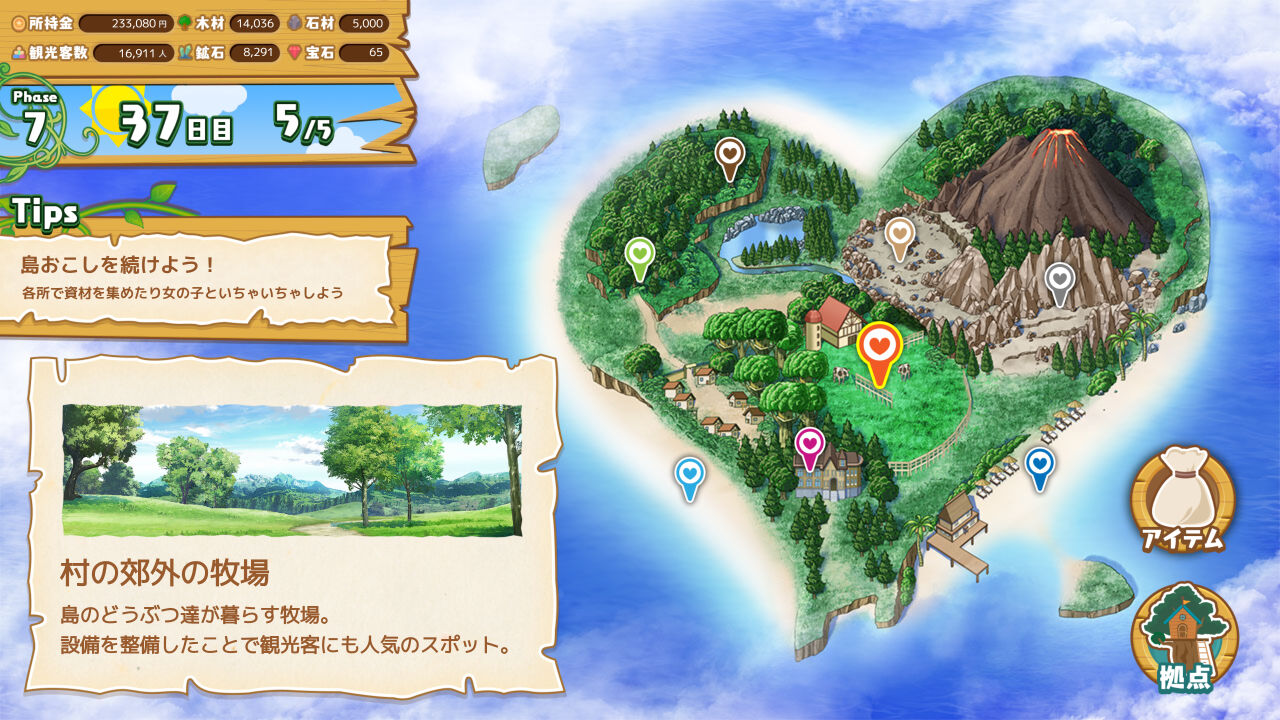島を開拓してリゾート地を作り、活気のある島を取り戻したい…!これが島民と神様の願いでした。