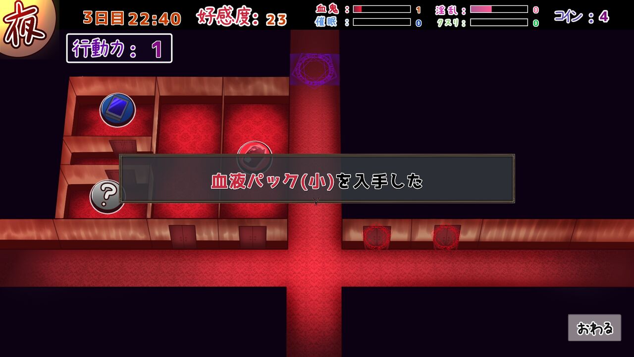 彼女に血を与えて結界を破壊することで探索エリアが増えていき、「催眠装置」や「クスリ」など、