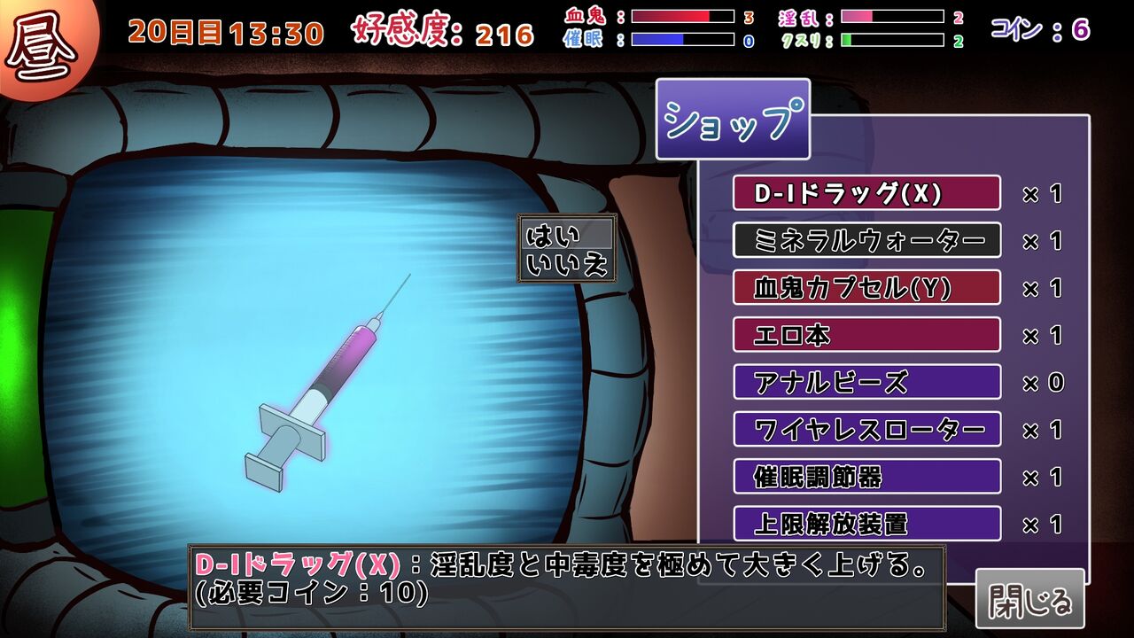 淫乱やクスリは、最奥エリアで『錠剤』『注射器』を安定供給できれば盛り放題です。