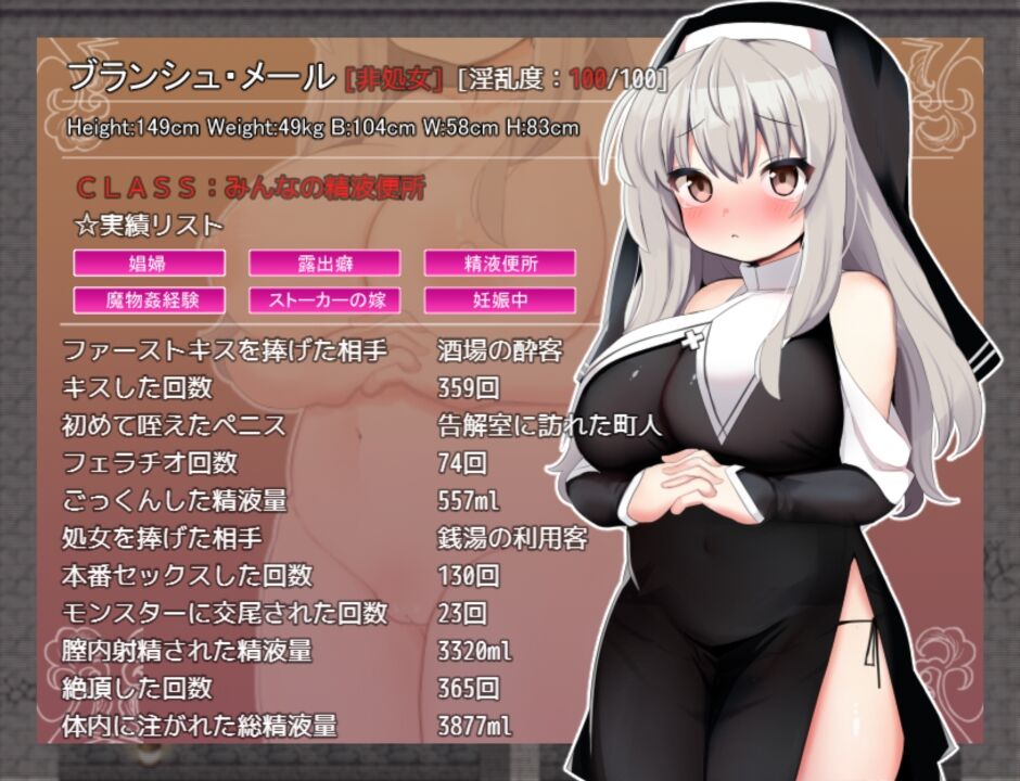 また、淫乱度に応じて「全裸徘徊」「路上売春」が可能になります。淫らに変わるシスターに注目。