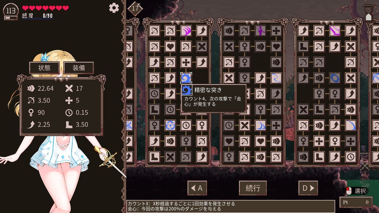 ランダム生成の『スキルツリー』を選択し、ポイントを消費してステータスとスキルを補強します。