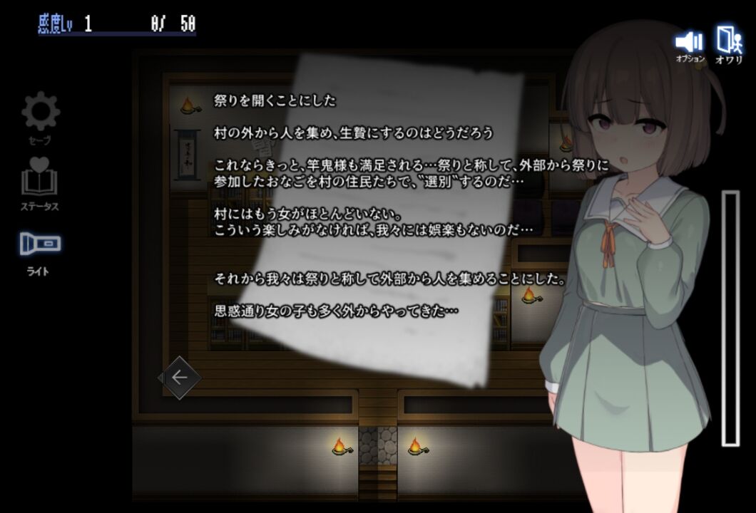 村人から選別という名のセクハラを受けたり、竿鬼様と呼ばれる化物に襲われる探索ゲームです。