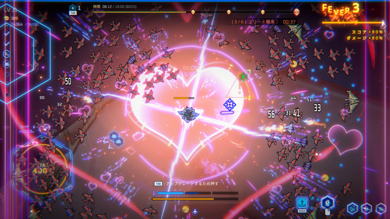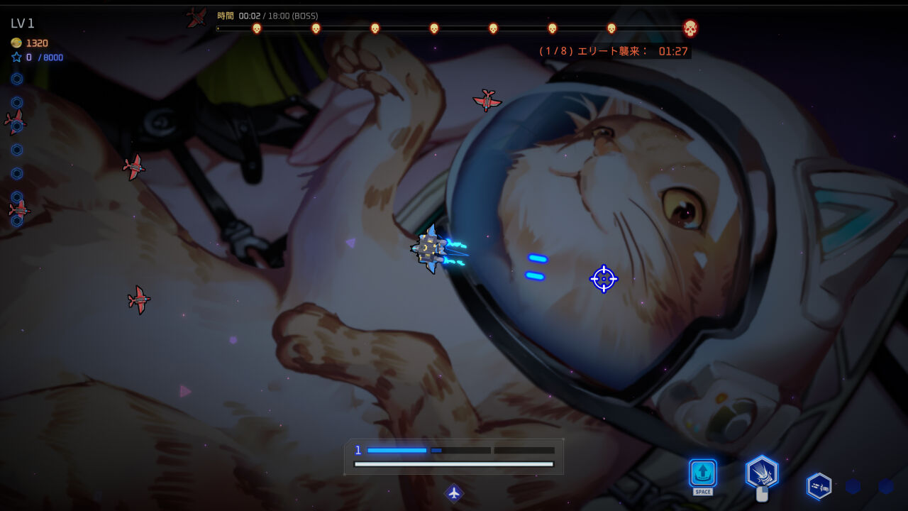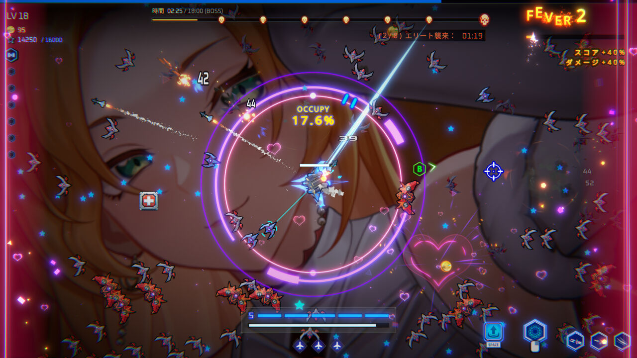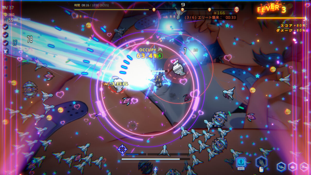 宇宙と美少女を背景に飛び散る火力兵器がド派手!経験値が溜まることで『脱衣ゾーン』が出現し、