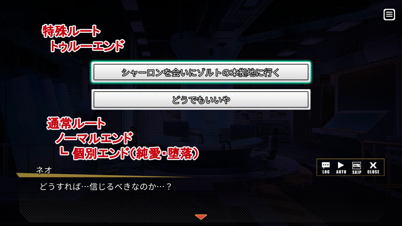 最終ステージの終えた後、それまでの選択肢に応じて「ノーマル・トゥルーエンド」を迎え、
