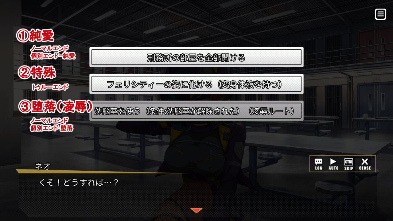 ノーマルエンドに限り、好感度MAXのヒロインとの個別エンド(純愛・堕落)を選択できます。