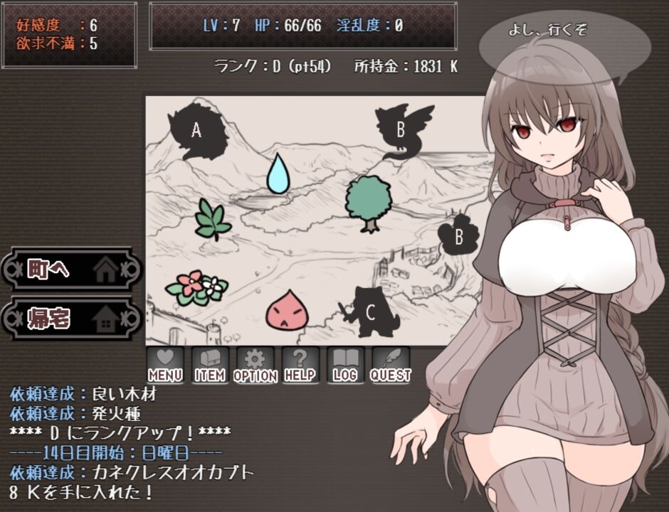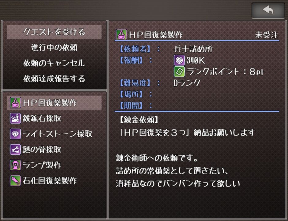 ランクは「納品クエスト」を反復することで昇級します。採取マップで素材を集め、自宅で錬金し、