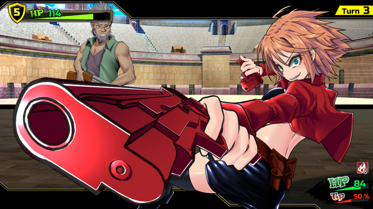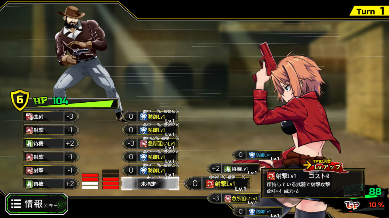 両者同時1ターン6回行動します。ド派手な連続射撃をお見舞いする「トリガーハッピー」は必見!