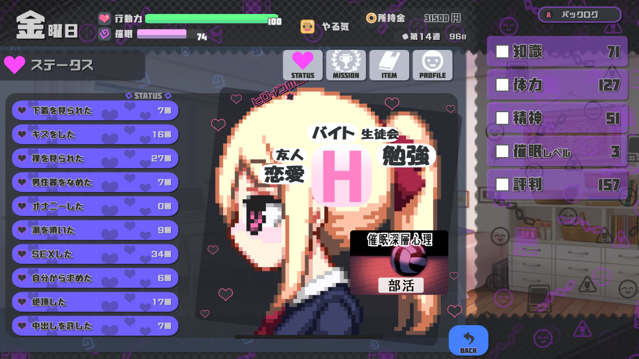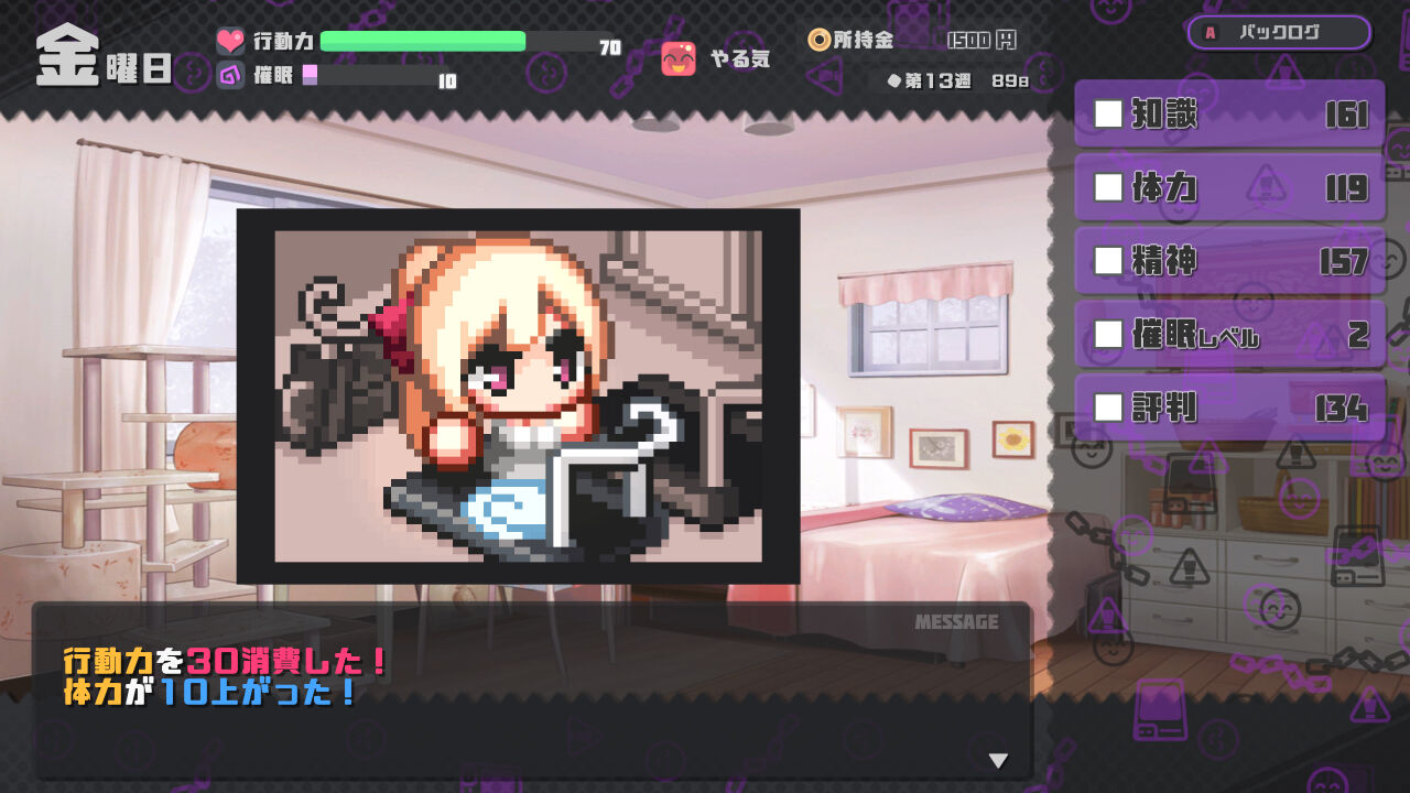 1日の行動は「お出かけ、特訓、休む」から一つ選び、イベント閲覧やステータス強化を行います。