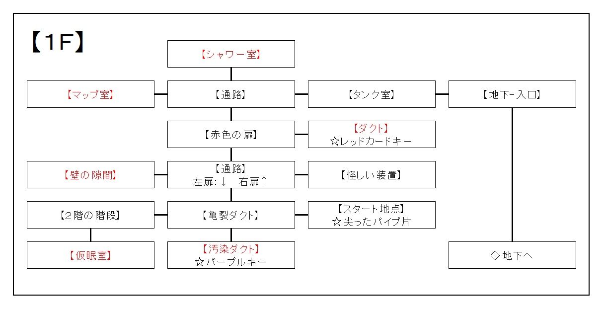 | - | 1階 | シャワー室、マップ室、ダクト、壁の隙間、汚染ダクト、仮眠室 |