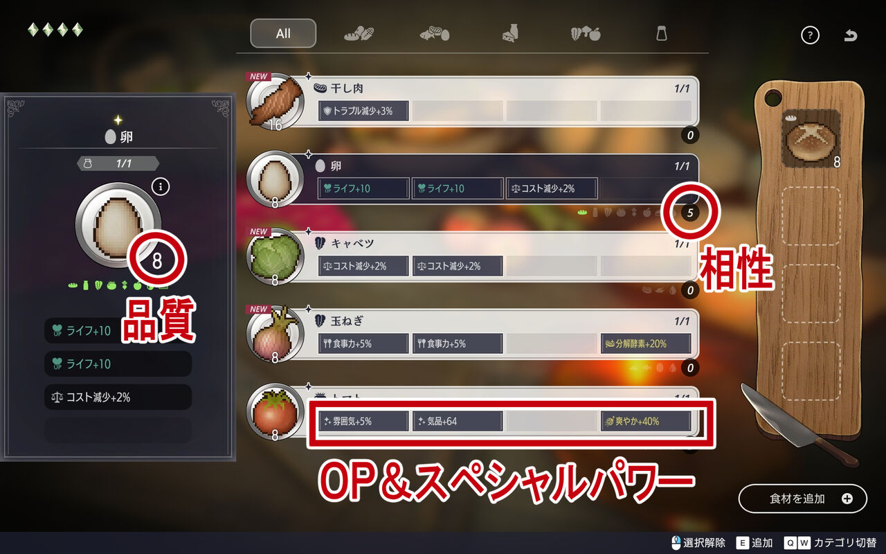 メイン食材を選んだ後は「品質(白)、相性(黒)」に注目です。