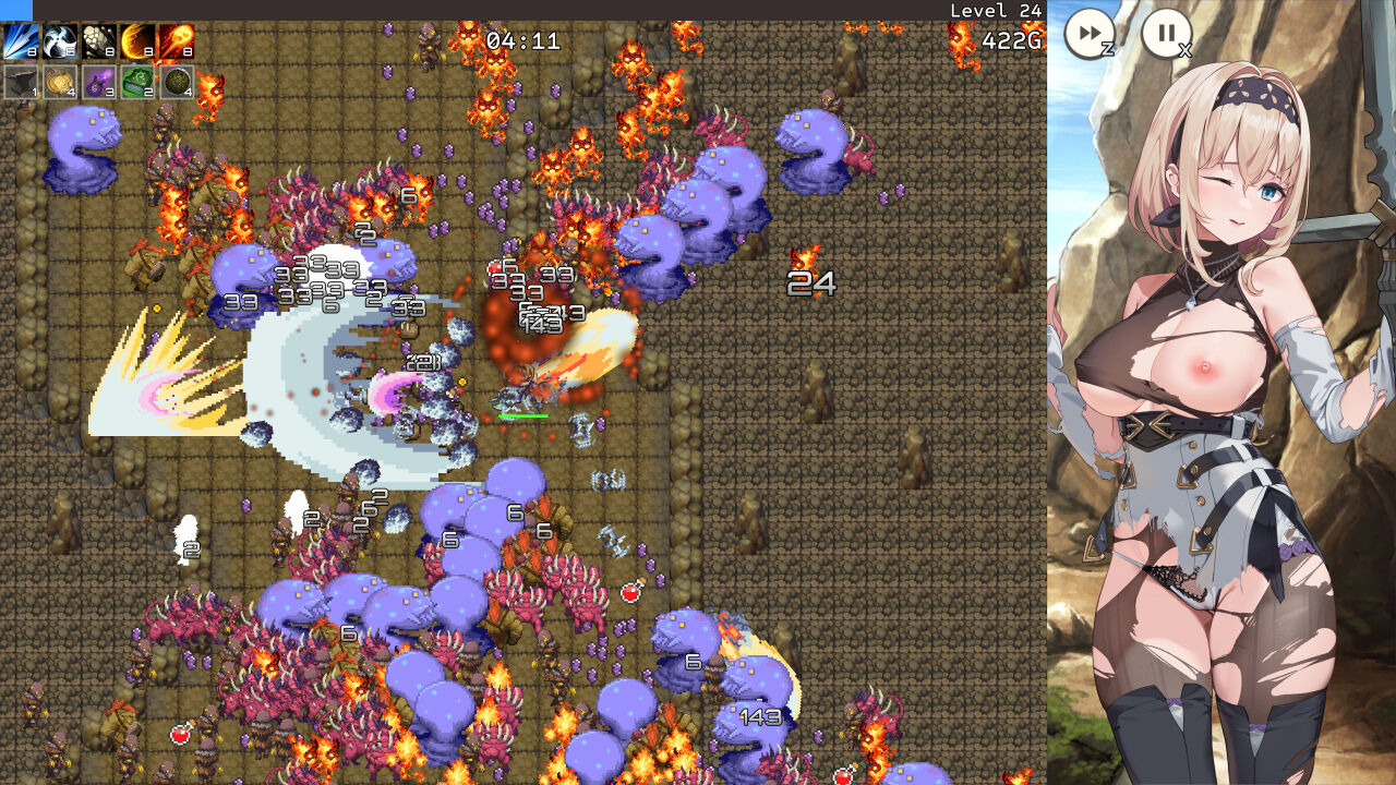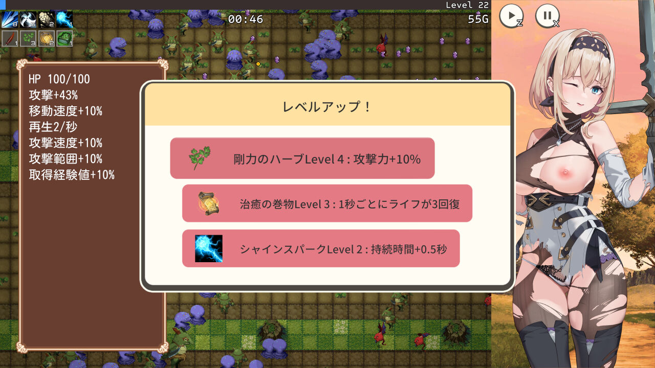 全6ステージ、武器7種類、パッシブ13種類、耐久時間10分のカジュアルな作風です。