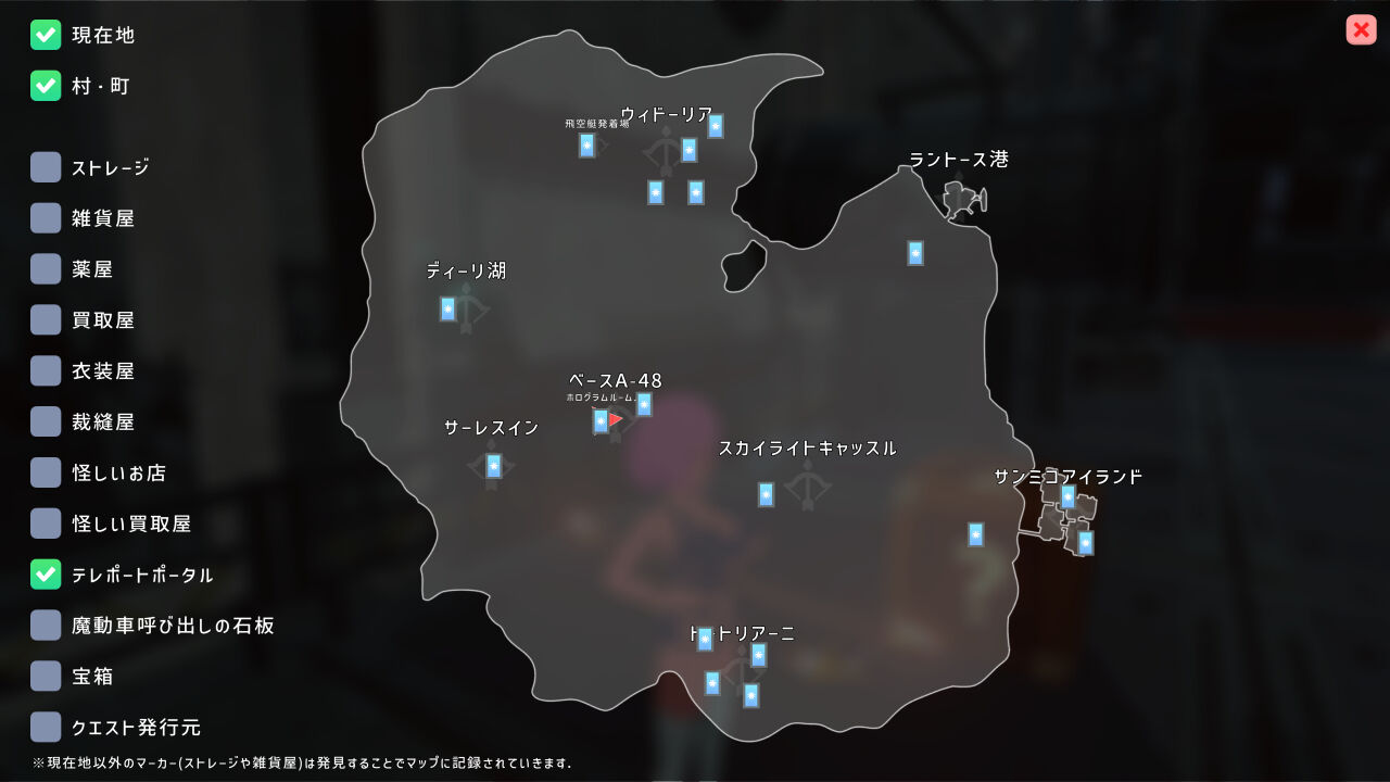 マップ(Mキー)を開き、「ストレージ」のある場所を巡りましょう。