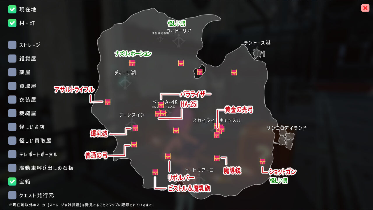 余談ですが、私の環境だと地図表示にすると宝箱等の表示がMAPの外にはみ出して表記されるのでちょっと不便。