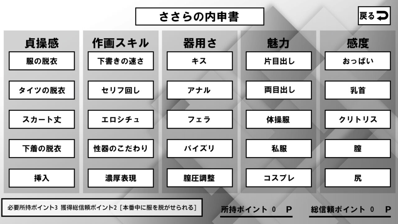 | エロ同人誌 | 信頼3 | 1500 | ささらがほしい時に渡すと好感度UP |