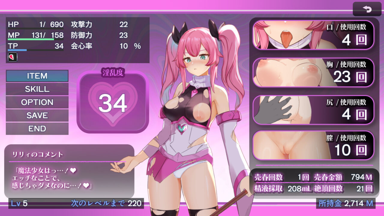 魔法陣から「売春ゾーン」に移動でき、淫乱度に応じて金策できます。