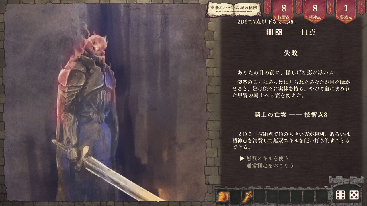 《居館二階小間》で「隠れてやり過ごす」を選び、 ダイスロールで失敗する。 |