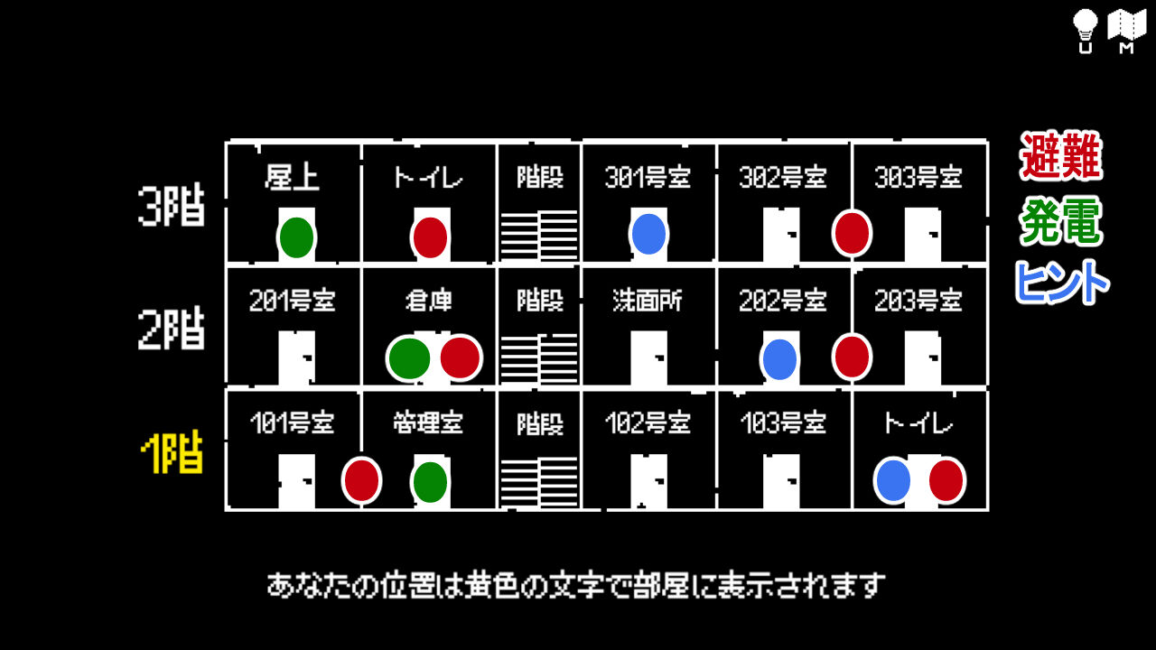 ・発電機は「1F管理人、2F倉庫、3F屋上」の固定配置です。