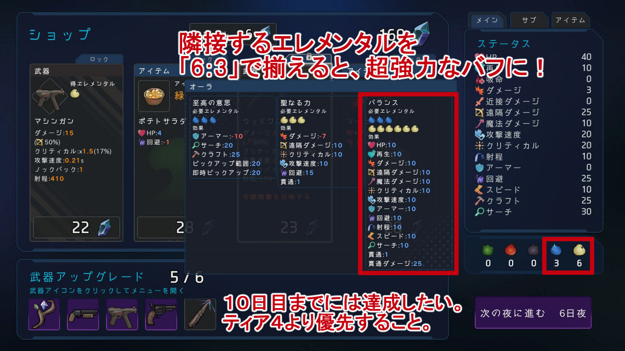 1日は「20~60秒」です。一夜を明けると「ショップ」から武器&アイテムを購入できます。