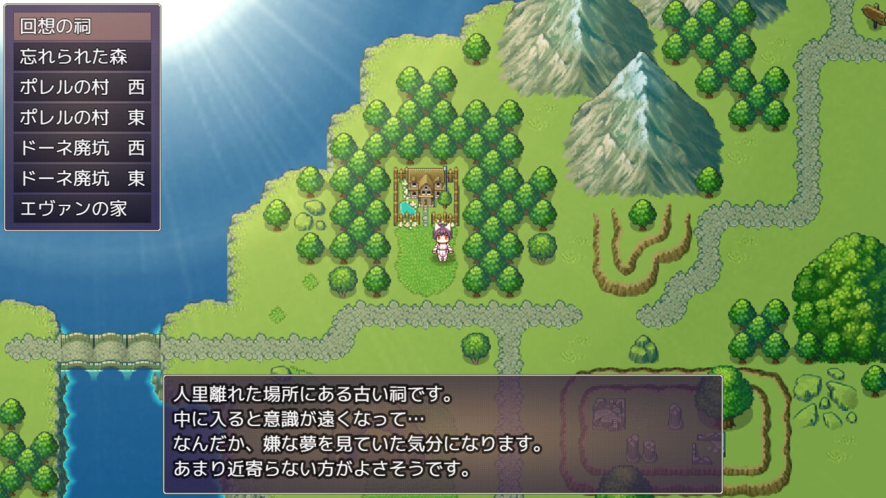 ワールドマップの森の裏側に「回想の祠」があります。